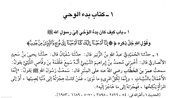 • It is known that this hadith also includes “he whose migration (Hijrah to Madeenah from Makkah) was for Allah and His Messenger, his migration was for Allah and His Messenger” but Imam Al-Bukhari brought this hadith from a chain of narration where this part was omitted