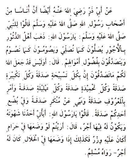 On the authority of Abu Dharr (may Allah be pleased with him): “Some people from amongst the Companions of the Messenger of Allah (SallaAllahu ‘alayhi wasallam) said to the Prophet (SallaAllahu ‘alayhi wasallam), “O Messenger of Allah, the affluent have made off with the rewards; they pray as we pray, they fast as we fast, and they give [much] in charity from their surplus wealth.” He (SallaAllahu ‘alayhi wasallam) said, “Has not Allah made things for you to give in charity? Truly every tasbeehah [saying: ‘subhanAllah’] is a charity, and every takbeerah [saying: ‘Allahu akbar’] is a charity, and every tahmeedah [saying: ‘al-hamdu lillah’] is a charity, and every tahleelah [saying: ‘laa ilaha illaAllah’] is a charity. And commanding the good is a charity, and forbidding an evil is a charity, and in the bud`i [sexual act] of each one of you there is a charity.” They said, “O Messenger of Allah, when one of us fulfils his carnal desire will he have some reward for that?” He (SallaAllahu ‘alayhi wasallam) said, “Do you not see that if he were to act upon it [his desire] in an unlawful manner then he would be deserving of punishment? Likewise, if he were to act upon it in a lawful manner then he will be deserving of a reward.”