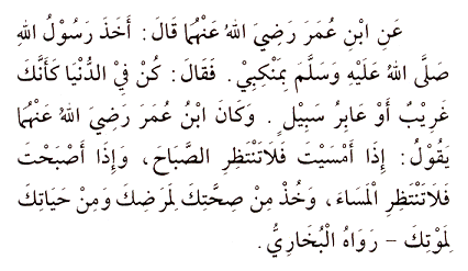 On the authority of Abdullah ibn Umar (RadhiyAllahu ‘anhuma), who said: The Messenger of Allah (SallaAllahu ‘alayhi wasallam) took me by the shoulder and said,
