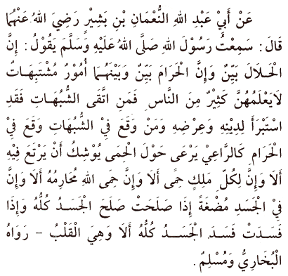 On the authority Abi Ab’dillahi al-Nu’man ibn Basheer (ra) who said: I heard the Messenger of Allah (peace be upon him) say: “That which is lawful is clear and that which is unlawful is clear and between the two of them are doubtful [or ambiguous] matters about which not many people are knowledgeable. Thus, he who avoids these doubtful matters certainly clears himself in regard to his religion and his honor. But he who falls into the doubtful matters falls into that which is unlawful like the shepherd who pastures around a sanctuary, all but grazing therein. Verily every king has a sanctuary and Allah’s sanctuary is His prohibition. In the body there is a morsel of flesh which, if it be sound, all the body is sound and which, if it be diseased, all the body is diseased. This part of the body is the heart”.